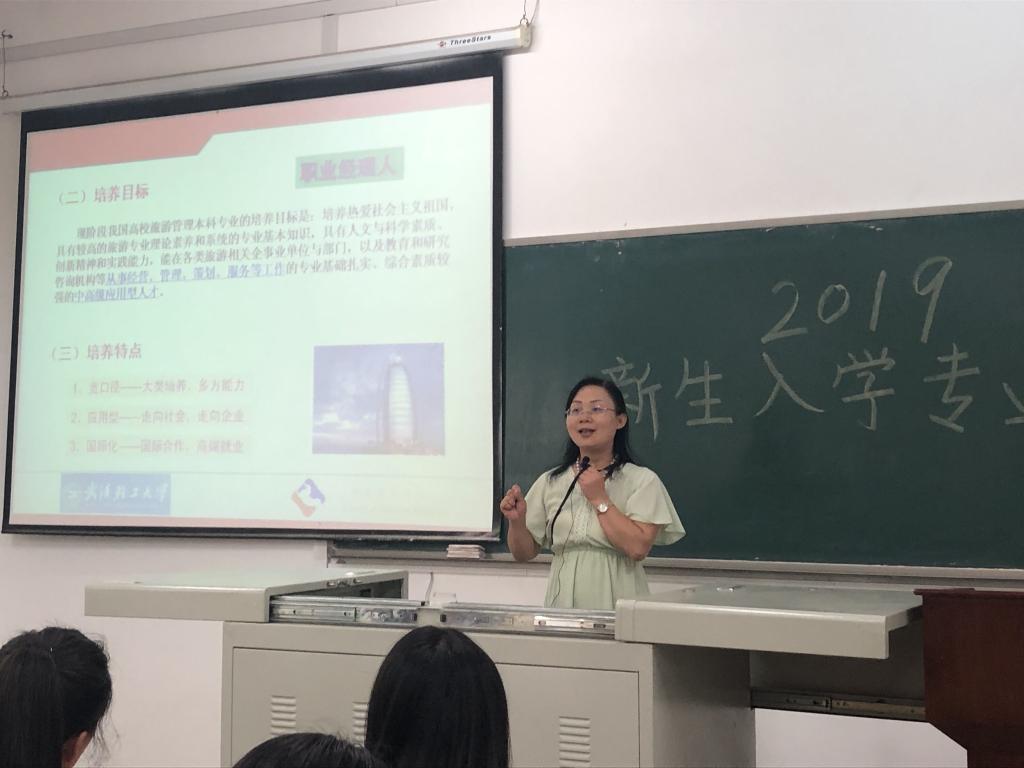 胡燦偉老師結合目前社會發(fā)展態(tài)勢告訴學生旅游管理專業(yè)的大好前景,以教研室老師為切入點全面介紹了旅游管理系課程,通過圖片形式展示了豐富多彩的課堂表現(xiàn)形式,并以2018、2019屆畢業(yè)生就業(yè)、考研詳細數(shù)據(jù)鼓勵學生打好基礎、定好目標,才能有更好發(fā)展。最后胡老師以一首“有一天我也會老”歌,告訴大家,不要虛度光陰,珍惜大學美好生活!