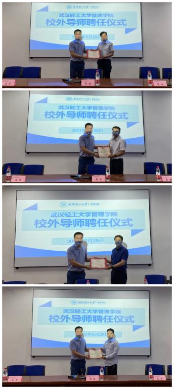研究生學位論文答辯是研究生教育過程中的一個重要環(huán)節(jié),既是研究生學習的最后階段,也是對畢業(yè)生培養(yǎng)質(zhì)量的一次檢閱。學院進行了精心組織和安排,特邀了一批校外知名教授和企業(yè)高管(兼任校外導師)擔任答辯主席。答辯會正式開始前,舉行了簡短的新增校外導師聘任儀式。管理學院蔡波書記出席聘任儀式,黃猛副院長為新聘校外碩導代表頒發(fā)了聘書,他們是萬建國(中財國洪投資管理有限公司正高級會計師)、戴國華(中鐵大橋局集團有限公司正高級會計師)、陳文達(聯(lián)投集團湖北聯(lián)合資信評估有限公司正高級會計師、常務(wù)副總經(jīng)理)、趙戰(zhàn)輝(武漢市農(nóng)業(yè)集團正高級會計師、副總經(jīng)理)。