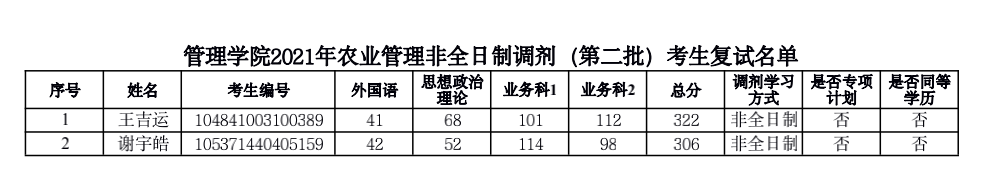 管理學(xué)院2021年農(nóng)業(yè)管理非全日制調(diào)劑(第二批)考生復(fù)試名單