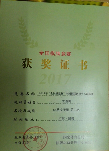 作為湖北省國際跳棋隊的一員,管逸飏遠(yuǎn)赴國內(nèi)外各地參加了許多知名的國際跳棋比賽,均取得優(yōu)異的成績。她曾獲2016年全國國際跳棋團體錦標(biāo)賽冠軍、2015年全國智力運動會“達爾文杯”國際跳棋個人賽64格女子組季軍等。