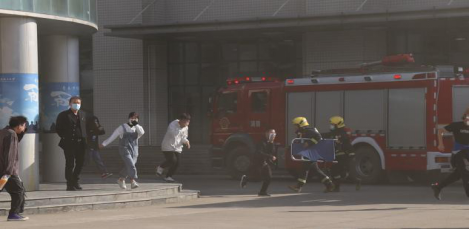 清脆的哨響聲過(guò)后,逃生模擬演練正式開始。“快來(lái)人啊,大活著火了!”伴隨著三樓陽(yáng)臺(tái)上飄出的陣陣濃煙,數(shù)十名同學(xué)向外揮舞著毛巾呼救。安保人員緊急撥打119火警電話,消防車?guó)Q笛迅速抵達(dá)“起火”教學(xué)樓。穿過(guò)濃濃煙霧籠罩的樓道,消防員準(zhǔn)確找到被困學(xué)生,立即引導(dǎo)被困學(xué)生用濕毛巾捂住口鼻,彎腰快速通過(guò)消防通道,疏散至安全位置。在被困期間,一位同學(xué)扮演因過(guò)量吸入濃煙出現(xiàn)昏迷,消防員將其抬出后,立即送往校醫(yī)院進(jìn)行救治。
