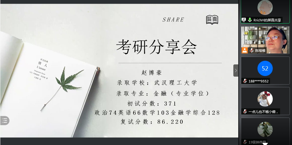 為了進(jìn)一步推進(jìn)我院旅游管理專業(yè)的應(yīng)用型人才培養(yǎng),充分發(fā)揮學(xué)院在學(xué)生考研方面的引領(lǐng)和指導(dǎo)作用,2021年6月6日晚上19點(diǎn),我院旅游管理系利用騰訊會議舉辦了線上考研經(jīng)驗(yàn)交流會。此次交流會主要面向我院18級、19級旅游管理專業(yè)學(xué)生,邀請了旅游管理趙博豪、楊小倩、魏胡婷等6位優(yōu)秀應(yīng)屆畢業(yè)生給學(xué)弟學(xué)妹們傳經(jīng)送寶,開展考研輔導(dǎo)。