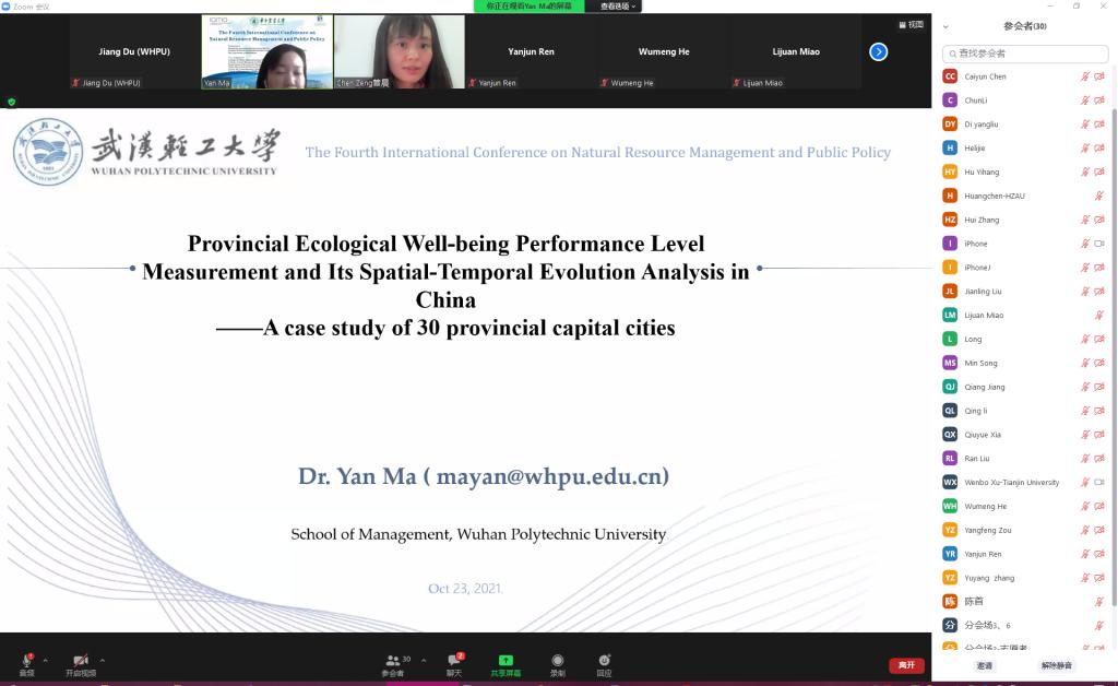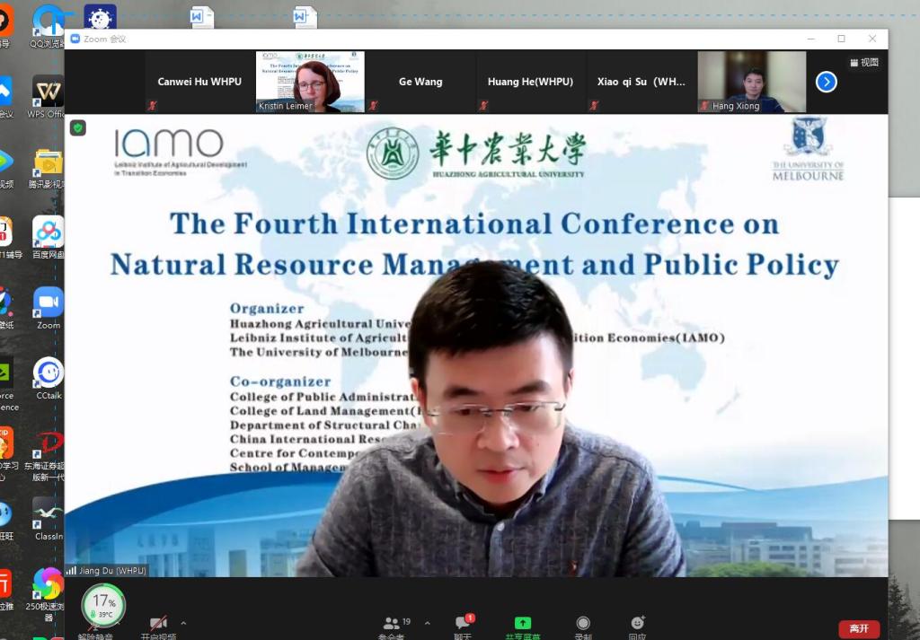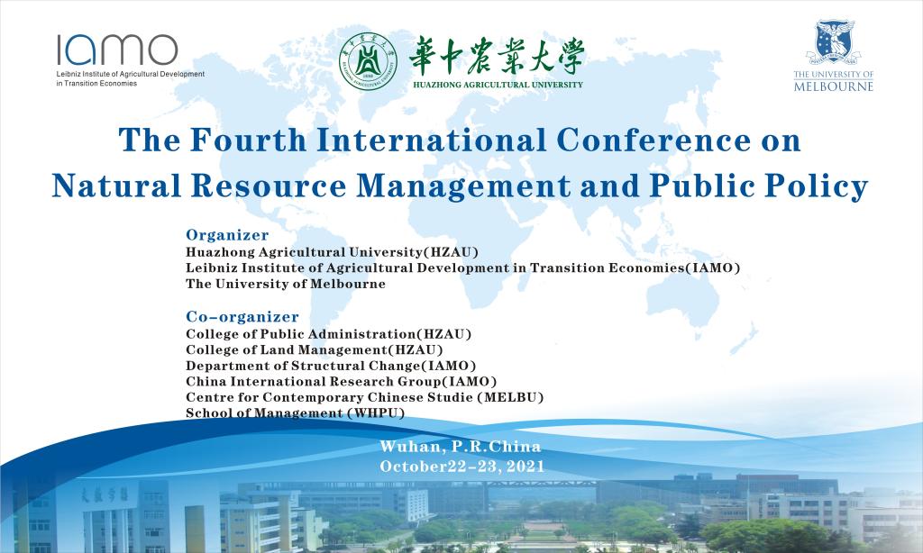 “第四屆自然資源管理與公共政策國際研討會”于2021年10月22日-23日線上舉行。此次研討會由華中農(nóng)業(yè)大學(Huazhong Agricultural University, HZAU)、德國萊布尼茨轉(zhuǎn)型經(jīng)濟農(nóng)業(yè)發(fā)展研究所(Leibniz Institute for Agricultural Development in Transformation Economies, IAMO)、澳大利亞墨爾本大學(The University of Melbourne, MELBU)聯(lián)合主辦,我校管理學院(School of Management (WHPU))是聯(lián)合承辦方之一。