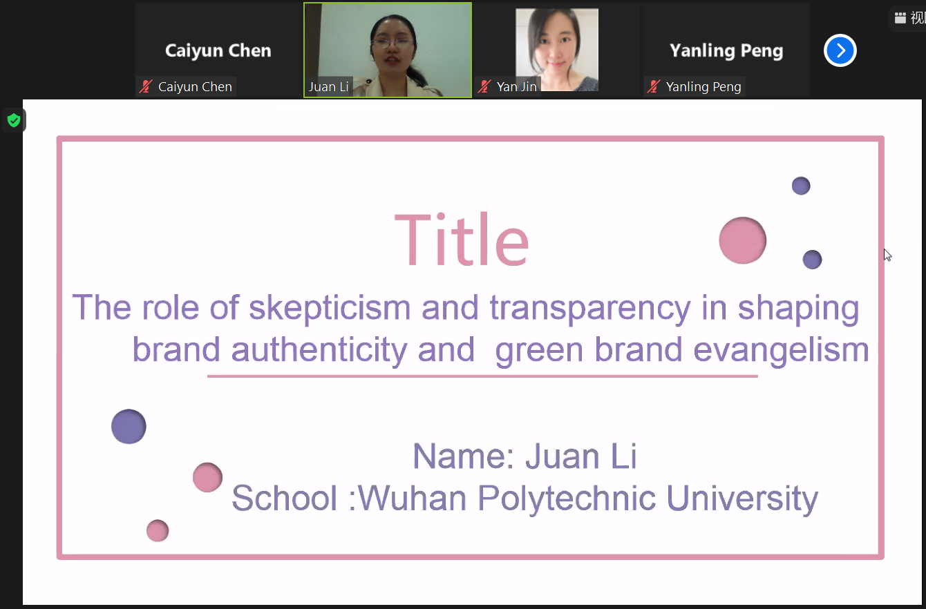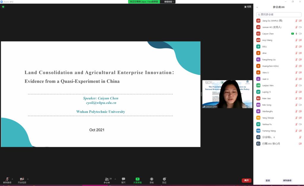 研討會的第二天,來自我校管理學院的五位博士教師(陳彩云、鄧梅娥、杜江、李娟、馬艷)參加了線上交流,在不同的分會場向到會的專家學者匯報了各自的研究成果。五位教師師以全英文的形式完成了匯報并進行了精彩的互動。其中,陳彩云博士匯報的題目是“Land consolidation and agricultural output: quasi-natural experimental evidence from China”;鄧梅娥博士的題目是“Effect of Transaction Rules on RSCs Transaction Costs Based on Williamson Transaction Cost Theory in Nanhai, China”;杜江博士、教授的題目是“Estimation of Agricultural Carbon Emissions and Low Carbon Transition in China: Provincial Data from 1991 to 2016”;李娟博士的題目是“The role of skepticism and transparency in shaping green brand authenticity and green brand evangelism”;馬艷博士的題目是“Provincial Ecological Welfare Performance Level Measurement and Its Spatial-Temporal Evolution Analysis in China”。