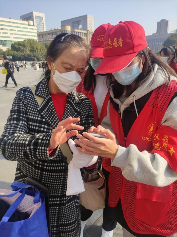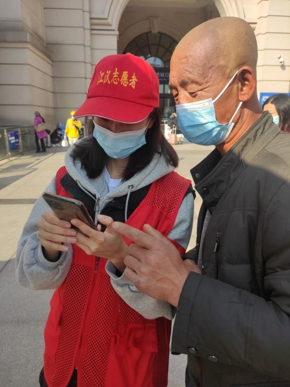 “請(qǐng)問一下,這個(gè)健康碼我在哪里打開啊?”“爹爹您別著急,我來教您。”12月5日,志愿者們身穿志愿者紅馬甲,在漢口火車站為來往旅客提供指引服務(wù),幫助老年旅客打開健康碼。管理學(xué)院十余名志愿者前往火車站地下空間、進(jìn)站口、志愿崗?fù)ぁ⒄厩皬V場(chǎng)等位置值守,隨時(shí)為有需要的旅客提供購(gòu)票引導(dǎo)及路線指引服務(wù)。帶隊(duì)負(fù)責(zé)人劉雅婕說“在國(guó)際志愿者日這天,我來到了漢口火車站。太陽很曬,心底很暖。志愿服務(wù)是志愿服務(wù)精神的綜合體現(xiàn),被需要也是一種快樂!今天我為他人作出指引,明日他人為我提供便捷,這便是奉獻(xiàn)的意義。”