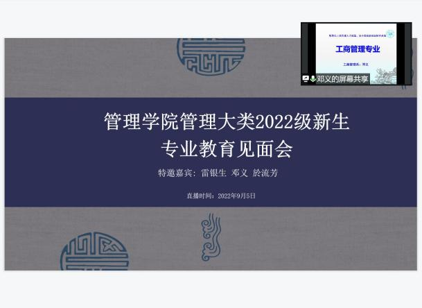 一場(chǎng)專業(yè)教育,一次智慧啟迪。9月5日上午9時(shí),管理學(xué)院舉行2022級(jí)新生專業(yè)教育見面會(huì),本次見面會(huì)以線上形式召開,管理學(xué)院各專業(yè)老師及444名新生參與本次活動(dòng)。