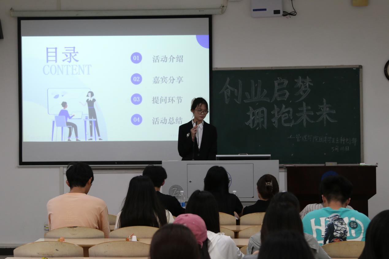 為支持和鼓勵(lì)同學(xué)們勇敢追求自己的創(chuàng)業(yè)夢(mèng),推動(dòng)大學(xué)生群體不斷創(chuàng)新和發(fā)展,管理學(xué)院于5月16日下午2點(diǎn)在知行樓104教師舉辦了“創(chuàng)業(yè)啟夢(mèng),擁抱未來(lái)”的主題沙龍分享會(huì)。本次會(huì)議由管理學(xué)院學(xué)生王溪主持。