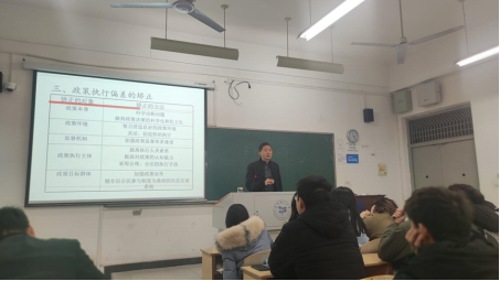 課程伊始,在簡要回顧政策執(zhí)行的基本概念與理論框架后,他迅速切入主題,圍繞政策執(zhí)行的策略與方法,展開了一場富有層次感與現(xiàn)實(shí)意義的講解。以現(xiàn)實(shí)問題作牽引,在講解政策執(zhí)行中“成本—收益”平衡時,引導(dǎo)學(xué)生思考:一項(xiàng)公共政策的推進(jìn),如何兼顧效率與公平?如何在制度變革中保障個體的權(quán)益?讓學(xué)生在思考中理會政策執(zhí)行不僅是技術(shù)過程,更是承載著公平正義的價值選擇。基層執(zhí)行者既要依法依規(guī),也需具備人文關(guān)懷,在復(fù)雜現(xiàn)實(shí)中不斷校準(zhǔn)政策目標(biāo)與社會效應(yīng)之間的平衡。