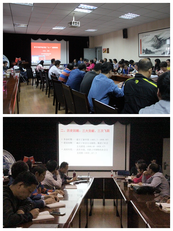 黃木老師以中國(guó)共產(chǎn)黨成立95周年紀(jì)念大會(huì)入題,從“七一”講話概覽、歷史回顧、現(xiàn)實(shí)啟迪、結(jié)合講話精神做好學(xué)校各項(xiàng)工作等四個(gè)方面引導(dǎo)全院教師360度全方位了解、領(lǐng)悟講話精神,重點(diǎn)給與會(huì)教師分享了“三大貢獻(xiàn)”、“三次飛躍”,“三個(gè)歷史啟示”以及“八個(gè)堅(jiān)持”,并指導(dǎo)學(xué)院落實(shí)“七一”講話精神,要著重加強(qiáng)基層黨組織的建設(shè)和思想政治工作,教師不忘初心教書(shū)育人,青年學(xué)生努力成為奮進(jìn)者、開(kāi)拓者和奉獻(xiàn)者。整場(chǎng)宣講報(bào)告角度新穎、重點(diǎn)突出、史料翔實(shí)、圖文并茂,受到了與會(huì)教師的一致好評(píng)。