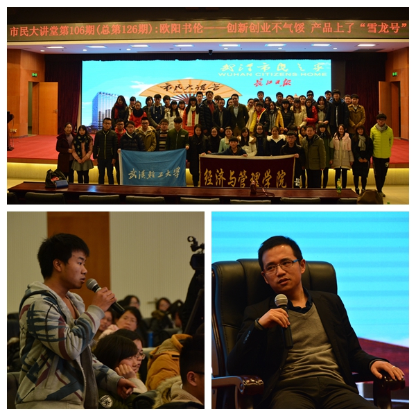 2016年1月9日下午,我校經(jīng)管學(xué)院04級(jí)工商管理專(zhuān)業(yè)畢業(yè)生歐陽(yáng)書(shū)倫做客武漢市民大講堂106期,接受長(zhǎng)江日?qǐng)?bào)的訪談,講述自己創(chuàng)新創(chuàng)業(yè)不氣餒的故事。我校經(jīng)管學(xué)院50余名師生參加了現(xiàn)場(chǎng)訪談活動(dòng)。