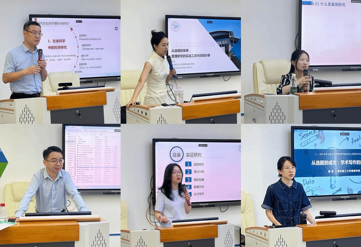 訓(xùn)練營期間,課程內(nèi)容豐富多元。黃猛率先開啟科研方法論課程,從科研本質(zhì)與發(fā)展路徑切入,結(jié)合案例研究方法、社會科學(xué)定量研究方法兩個方面介紹了研究生階段如何做好自己的科學(xué)研究。甘暢博士圍繞學(xué)術(shù)論文選題方法,以新穎視角為切入點,引導(dǎo)同學(xué)們?nèi)绾瓮诰蚓哂袃r值的研究方向。陳元博士則聚焦管理研究領(lǐng)域,分享實戰(zhàn)工具與經(jīng)驗,助力同學(xué)們將理論知識與實際科研場景緊密對接。瑞思數(shù)據(jù)庫高級培訓(xùn)師楊欣蕾圍繞數(shù)據(jù)采集與分析、金融數(shù)據(jù)庫實操與實證研究應(yīng)用展開分享。謝超紅、徐歡博士圍繞論文寫作全流程,從寫作技巧到選題成文閉環(huán),拆解論文創(chuàng)作關(guān)鍵環(huán)節(jié),為同學(xué)們理清寫作思路。劉念博士則深入詳解案例研究方法,剖析案例選取、分析、應(yīng)用要點,豐富同學(xué)們研究方法儲備。公共管理學(xué)2023級研究生劉博遠(yuǎn)同學(xué),結(jié)合校第十八屆研究生科技論文報告會一等獎(人文社科組)的實踐經(jīng)歷,分享了科研創(chuàng)新與論文打磨的心得,以“朋輩榜樣”力量激發(fā)同學(xué)們的科研創(chuàng)新。