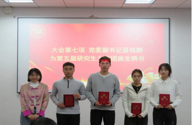 聶銘靜、張世瑞、常鋮為第五屆研究生分會(huì)干部成員頒發(fā)證書。