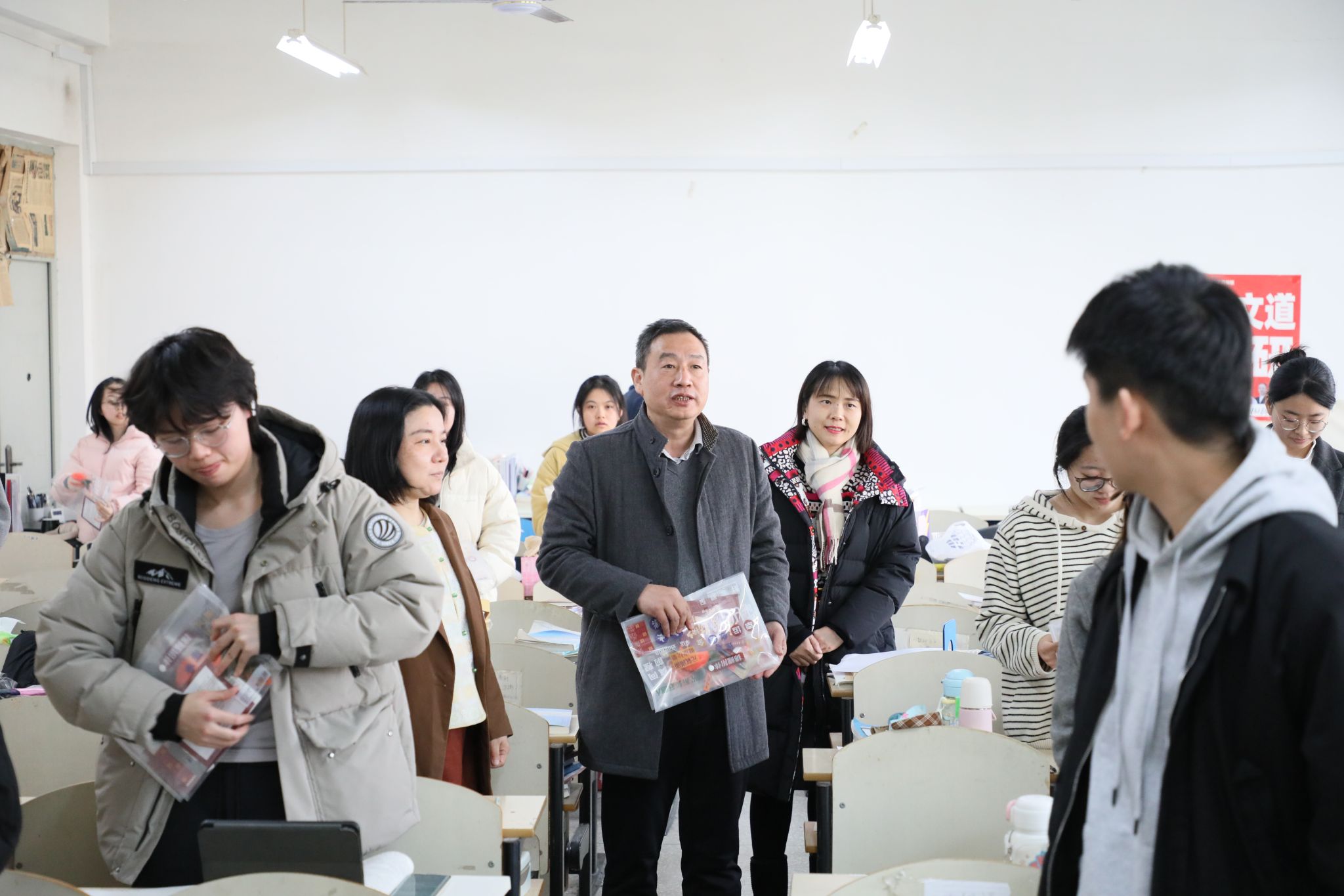 學(xué)院領(lǐng)導(dǎo)與考研學(xué)子親切交流,用溫暖的話語為學(xué)子們加油鼓勁,并叮囑大家考前檢查好所需證件、文具等物品,做到有備無患。同時注意防寒保暖,合理安排作息,以飽滿的精神狀態(tài)奔赴考場。隨后,他們親自將一份份精心準(zhǔn)備的“考研加油包”遞到同學(xué)們手中,禮包內(nèi)含考研文具、祝福賀卡及寓意“心想事成”的柿子,美好的祝愿與深切的牽掛,讓這份慰問更添溫情與力量。