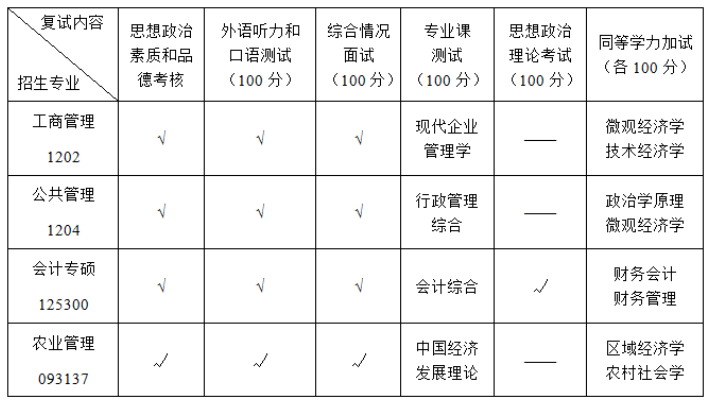 5.同等學力考生及復試時尚未取得畢業(yè)證書的自學考試和網(wǎng)絡教育考生,在上述測試的基礎上加試兩門業(yè)務課,加試科目不得與初試及復試科目相同,試題內容應涵蓋所報考專業(yè)要求的本科主干課程,難易程度按本科教學大綱的要求掌握,每門業(yè)務課滿分100分,60分及以上為合格。成績可不計入復試總成績,但不合格者不予錄取。加試業(yè)務課參照專業(yè)課測試的方式進行。