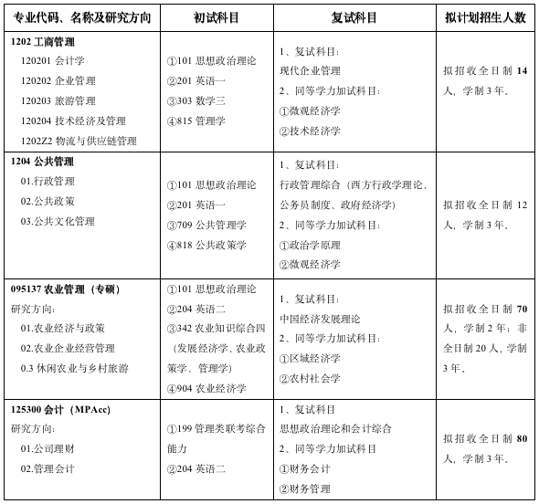2個(gè)一級(jí)學(xué)碩學(xué)位授權(quán)點(diǎn):工商管理、公共管理,2個(gè)專業(yè)學(xué)位授權(quán)點(diǎn):農(nóng)業(yè)管理(農(nóng)學(xué)碩士)、會(huì)計(jì)專碩(MPAcc)繼續(xù)招收碩士研究生,接收符合條件的同等學(xué)力、非全日制(無需脫產(chǎn)學(xué)習(xí))、退役大學(xué)生士兵報(bào)考,畢業(yè)時(shí)頒發(fā)碩士研究生畢業(yè)證和學(xué)位證。