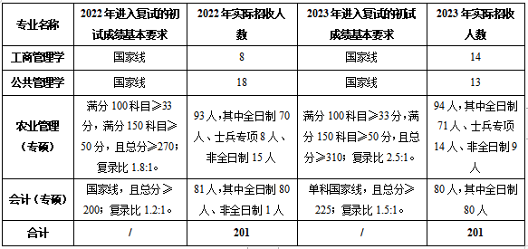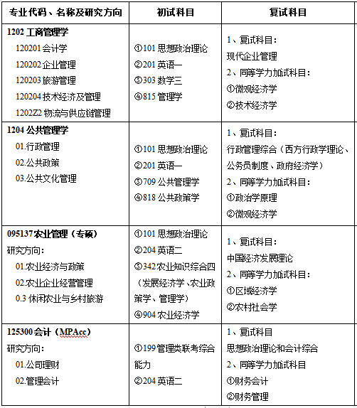 2個(gè)一級(jí)學(xué)碩學(xué)位授權(quán)點(diǎn):工商管理學(xué)、公共管理學(xué),2個(gè)專(zhuān)業(yè)學(xué)位授權(quán)點(diǎn):農(nóng)業(yè)管理(農(nóng)學(xué)碩士)、會(huì)計(jì)專(zhuān)碩(MPAcc)繼續(xù)招收碩士研究生,接收符合條件的同等學(xué)力、非全日制(無(wú)需脫產(chǎn)學(xué)習(xí))、退役大學(xué)生士兵報(bào)考,畢業(yè)時(shí)頒發(fā)碩士研究生畢業(yè)證和學(xué)位證。