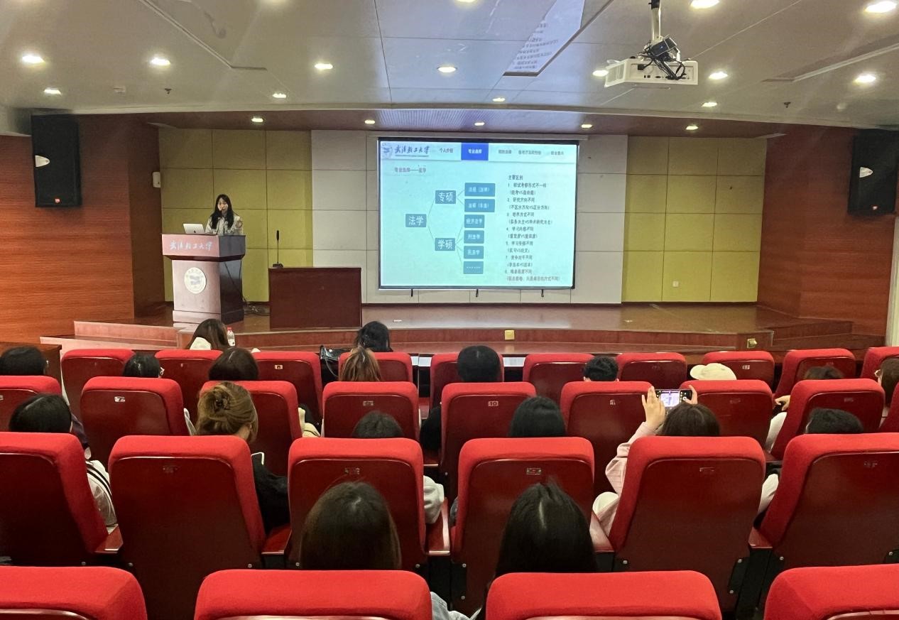活動(dòng)伊始,主講嘉賓馮玉嬌對(duì)自身的考研情況進(jìn)行介紹。講述自己跨考法學(xué)最終成功上岸中南財(cái)經(jīng)政法大學(xué)的經(jīng)歷。接著談到選擇考研的原因,不論是想在學(xué)術(shù)領(lǐng)域繼續(xù)深造,還是增強(qiáng)自身核心競(jìng)爭(zhēng)力找到一份合適的工作都是在座同學(xué)們心照不宣的答案。在專業(yè)選擇方面,馮玉嬌從宏觀層面,結(jié)合管理學(xué)院同學(xué)們歷年考研選擇方向和近兩年國(guó)家線情況進(jìn)行分析。并由法學(xué)進(jìn)行舉例,從六個(gè)角度解釋學(xué)碩和專碩的區(qū)別。在院校選擇上,馮玉嬌建議同學(xué)們充分考慮自身實(shí)力的同時(shí)對(duì)目標(biāo)不懈追求,合理利用研招網(wǎng)、各學(xué)校研究生招生網(wǎng)等各大平臺(tái)研究意向院校的報(bào)錄比、分?jǐn)?shù)線情況。
