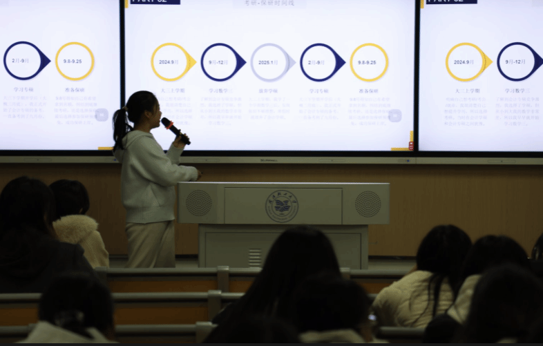 龐兼從保研政策解讀、專業(yè)學(xué)習(xí)以及綜合素質(zhì)三個(gè)方面講解自己的保研之路,為大家分享自己的學(xué)習(xí)方法;張靜圍繞“你走的每一步都算數(shù)”這一主題從學(xué)習(xí)成績、推免要求及流程、信息獲取、心態(tài)管理幾個(gè)角度展開,分享自己的經(jīng)歷與意見;郭欣慧從考研與保研的時(shí)間線、保研要點(diǎn)以及獨(dú)到的保研心得等方面為大家分享“保研秘籍”。