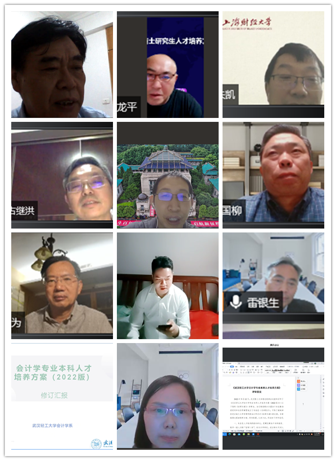 為進(jìn)一步做好人才培養(yǎng)方案頂層設(shè)計(jì),夯實(shí)會(huì)計(jì)學(xué)國家一流專業(yè)建設(shè)點(diǎn)基礎(chǔ),全面提高會(huì)計(jì)學(xué)專業(yè)人才培養(yǎng)質(zhì)量,5月12日,管理學(xué)院以視頻會(huì)議形式組織召開了2022版會(huì)計(jì)學(xué)專業(yè)本科人才培養(yǎng)方案評(píng)審會(huì)。會(huì)議邀請(qǐng)上海財(cái)經(jīng)大學(xué)、武漢大學(xué)、中南財(cái)經(jīng)政法大學(xué)、浙江工商大學(xué)等校知名會(huì)計(jì)學(xué)專家4人,湖北省總會(huì)計(jì)協(xié)會(huì)會(huì)長古繼洪、武漢建工集團(tuán)原總會(huì)計(jì)師萬建國、湖北聯(lián)合資信評(píng)估有限公司常務(wù)副總經(jīng)理陳文達(dá)等3名實(shí)務(wù)界專家擔(dān)任評(píng)審會(huì)專家評(píng)委。