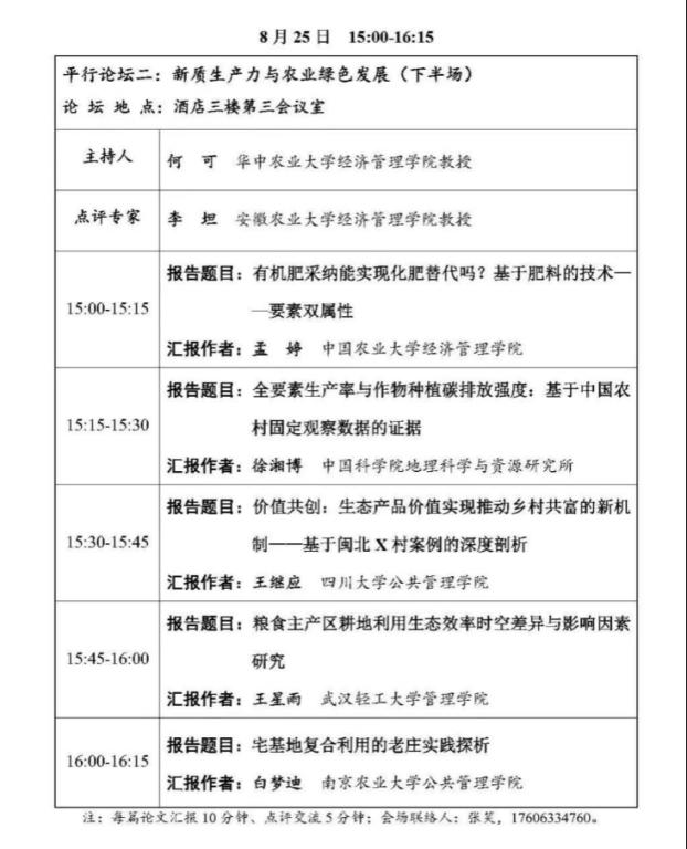 我院公共管理專業(yè)2022級研究生王星雨參加了本次會議,并在該會議的平行論壇二“新質(zhì)生產(chǎn)力理論與農(nóng)業(yè)綠色發(fā)展”中對她的學(xué)術(shù)論文《糧食主產(chǎn)區(qū)耕地利用生態(tài)效率時(shí)空差異與影響因素研究》進(jìn)行了精彩的匯報(bào)。